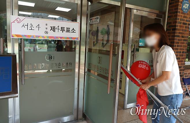 21대 대통령 선거날인 3일 오전 서울 서초구 원명초등학교에 설치된 투표소에서 김문수 국민의힘 후보 지지자가 '대통령 김문수'가 적힌 빨간 풍선을 학교 현관에 두고 투표소에 들어가 투표사무원이 폐기 처분하는 일이 벌어졌다.