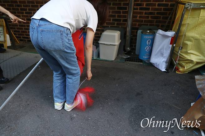 | ▲ 투표사무원이 '대통령 김문수'가 적힌 빨간 풍선을 터뜨려 제거하고 있다. |
