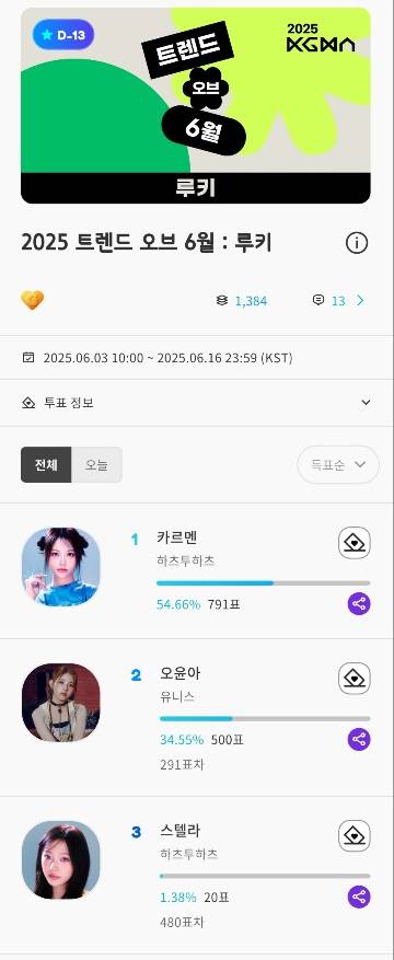 한편, 오늘(3일)부터는 2025 KGMA ‘트렌드 오브 6월’의 K팝 그룹과 루키 부문의 투표가 새롭게 시작됐다. 현재 K팝 그룹 부문은 방탄소년단, 뉴진스, 데이식스 득표순으로 투표가 진행 중이며, 루키 부문에서는 하츠투하츠의 카르멘, 유니스의 오윤아, 하츠투하츠의 스텔라가 상위권을 차지하며 주목을 받고 있다.