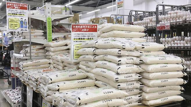 ▲ 일본 남서부 미야자키현 휴가 시의 한 슈퍼마켓에서 여러 종류의 쌀이 담긴 대형 포대들이 판매되고 있다.