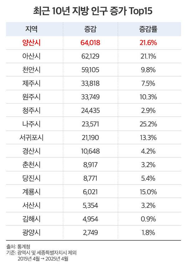 특히 경남 양산, 충남 아산·천안, 제주 제주시, 강원 원주 등은 최근 10년간의 인구 역전 흐름 속에서도 성장세를 보이며 ‘살고 싶은 지방 도시’로 떠오르고 있다.