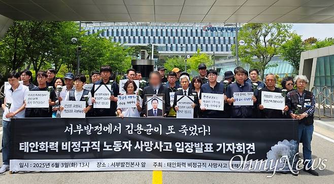 | ▲ 3일 오후 1시 태안 서부발전본사 앞에서 태안화력 비정규직 사망사고 대책위(가)가 기자회견을 열고 전날 발생한 발전비정규직 노동자 김충현씨 사망과 관련해 입장을 밝히고 있다. |