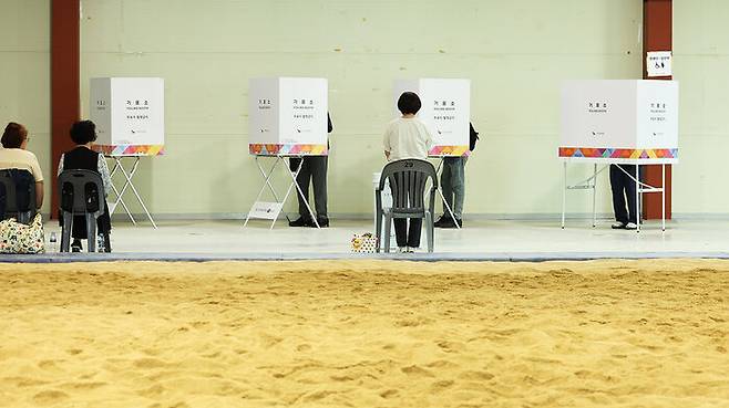 ▲ 제21대 대통령선거 투표일인 3일 경기도 성남시 중원구 성남종합운동장 실내씨름장에 마련된 성남동 제2투표소에서 유권자들이 투표하고 있다.