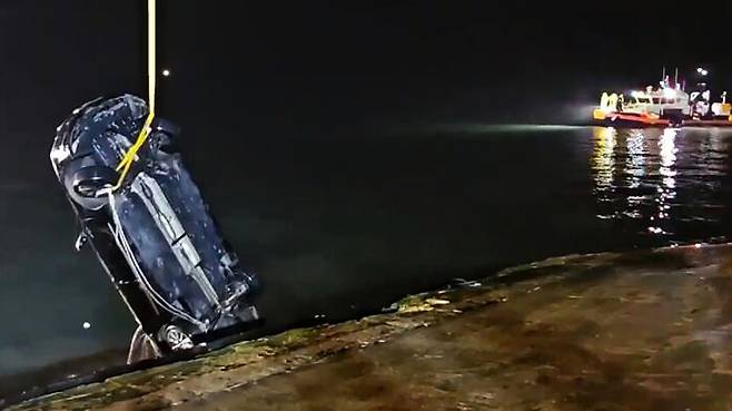 ▲ 2일 오후 전남 진도군 임회면 진도항 인근 해상으로 빠진 일가족 탑승 차량이 인양되고 있다.
