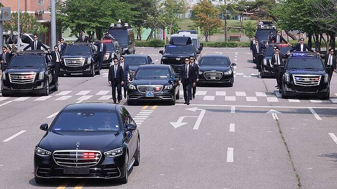 ▲ 대통령경호처 경호관들이 지난 5월 27일 서울 강서구 경호안전교육원에서 제21대 대통령 취임식을 앞두고 취임식 차량 퍼레이드 훈련 모습을 공개하고 있다.