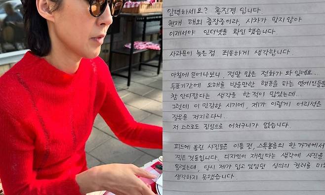 3일 홍진경은 자신의 계정에 "현재 해외 출장 중이라, 시차가 맞지 않아 이제서야 인터넷을 확인했다. 사과문이 늦은 점 죄송하게 생각한다"라는 자필 사과문을 게재했다.