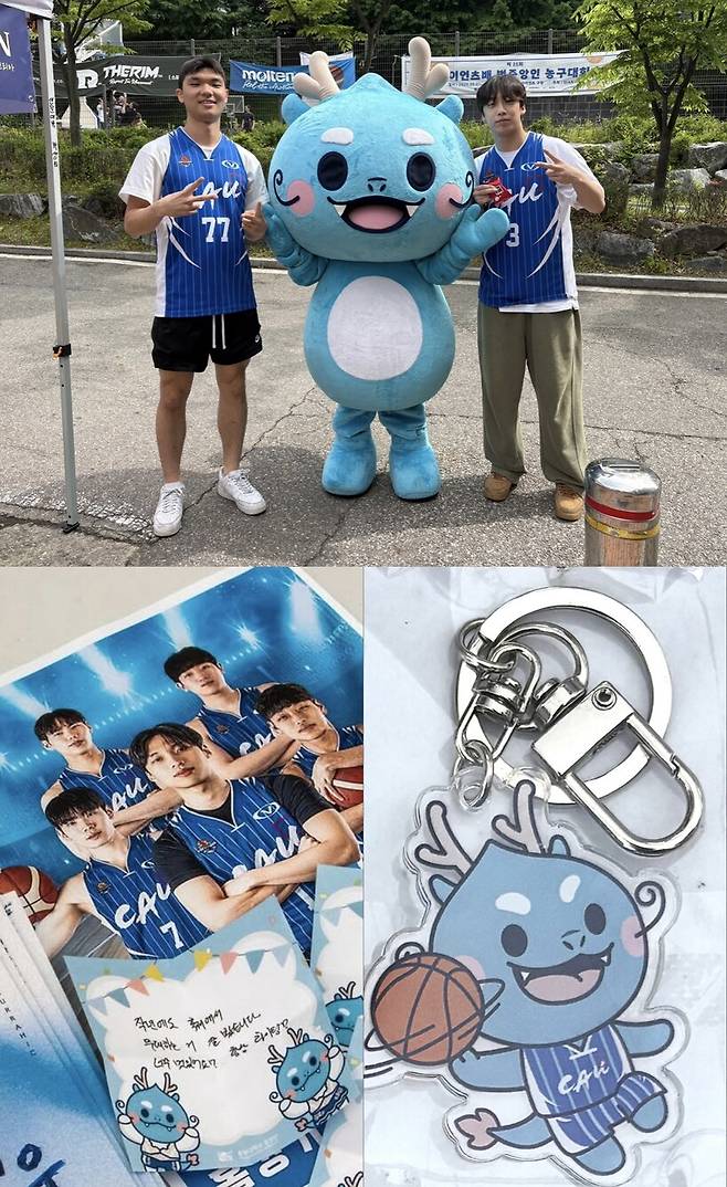 중앙대 다빈치캠퍼스의 축제는 2학기에 진행되지만 농구부에는 축제보다 더 특별한 행사가 있었습니다. 중앙대 스포츠팀을 홍보하는 부스가 진행되었기 때문인데요. 5월 15일에는 서울캠퍼스에서, 5월 22일에는 다빈치캠퍼스에서 농구부 선수들이 함께하는 중앙대 스포츠 홍보대사 블루가디언의 특별 부스가 열렸습니다. 김휴범, 도현우, 서정구, 유형우, 진현민, 정현석 선수가 함께한 부스에서는 중앙대 스포츠팀을 알리고 스포츠에 관련된 여러 미니게임을 함께하면서 성공하신 분들께는 귀여운 푸앙이(중앙대 마스코트) 키링을 증정했습니다.