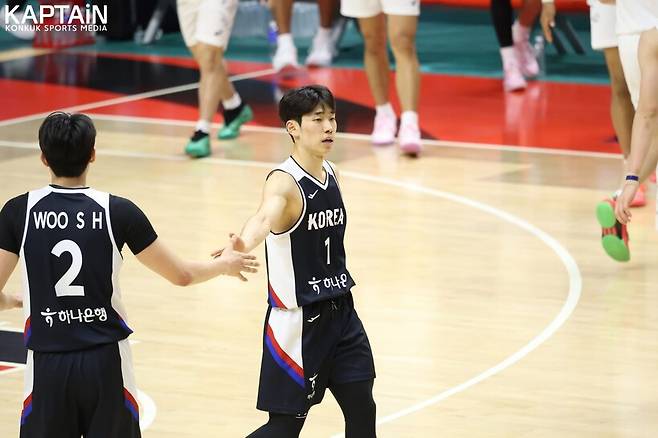 국가대표 데뷔 경기에서 4득점을 올렸던 김준영은 이튿날(5/17) 17득점 6어시스트로 앞선을 이끌었습니다. 1쿼터에 한국이 외곽포로 점수를 쌓았습니다. 이때 김준영도 석 점 2개를 꽂아 힘을 보탰습니다.
