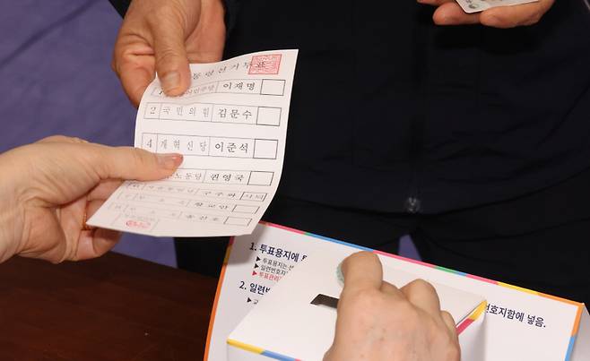[제21대 대통령선거일인 3일 오전 제주시 연동 제1투표소가 마련된 제주도의회 의원회관에서 한 유권자가 투표용지를 배부받고 있다. (사진=연합뉴스)]