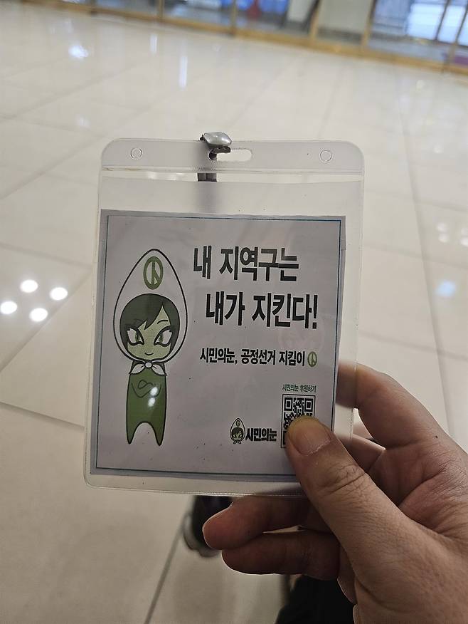 | ▲ 사전투표함 지킴이 명찰. 채팅방에 올라온 시민의 눈 공정 선거 지킴이 이미지를 편집 후 인쇄했다. |