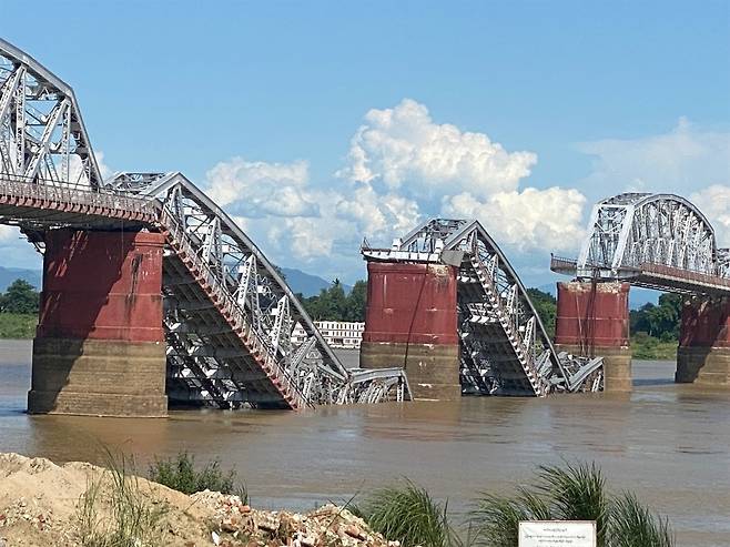 | ▲ 미얀마 대지진으로 무너진 철교 만달레이주와 사가잉주를 잇는 철교입니다. |