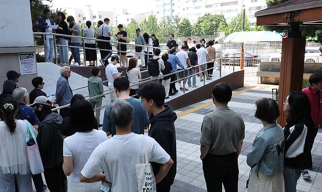 소중한 한 표 행사 제21대 대통령선거 본투표일인 3일 서울 영등포구 여의도중학교에 마련된 여의도제4투표소에서 시민들이 투표를 위해 줄을 서 있다. 연합뉴스