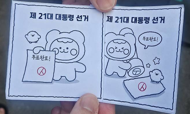 이날 오전 서울 마포구 공덕동 주민센터의 투표소에서 만난 박모(25)씨는 투표를 마친 뒤 캐릭터 ‘가나디’가 그려진 투표 인증 용지로 인증사진을 남겼다. 박씨는 “캐릭터가 귀여워서 인증하기 위해 가져왔다”며 “엑스(X·옛 트위터)를 중심으로 이런 인증 방식이 유행하는데, 대선날을 기록하고 보관하고 싶었다”고 말했다. 같은 투표소에서 만난 오민주(22)씨는 “굿즈나 직접 캐릭터 등을 그린 용지에 투표 인증을 하고 있다”며 “‘덕질’도 할 수 있어 일석이조”라고 했다.