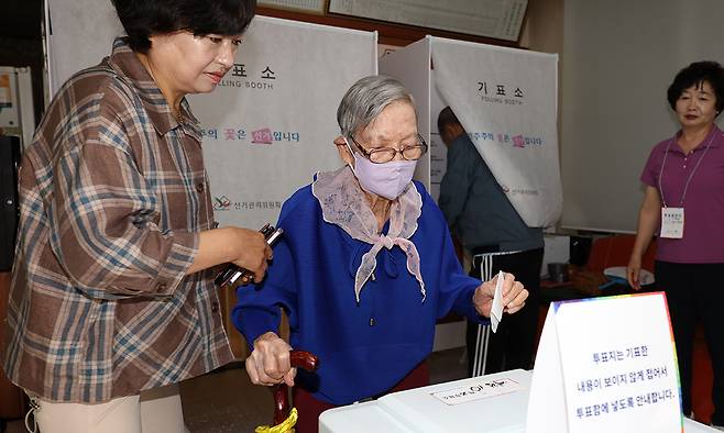 109세 할머니도… 대선일인 3일 광주 동구 계림1동 제2투표소에서 109세 김정자 할머니가 기표지를 투표함에 넣고 있다. 광주=뉴스1
