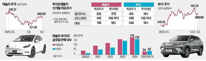 UBS는 테슬라보다 BYD의 전망을 밝게 봤다. UBS는 “최근 유럽 소비자 설문에서 ‘BYD를 구매할 의향이 있다’ 응답이 2년 전보다 두 배 늘었다”면서 “AI 부문에서 높은 성장 동력을 지녔지만 테슬라와의 시총 격차는 지나치다”고 분석했다. 그러면서 BYD 목표주가를 종전 450홍콩달러에서 540홍콩달러로 상향했다.