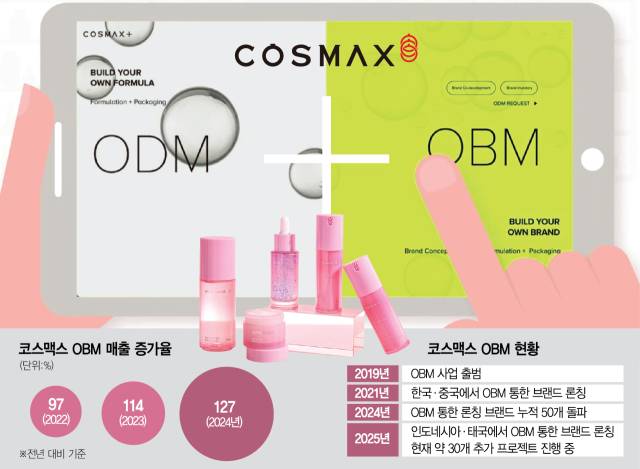 코스맥스는 2019년 OBM 진출 이후 2년 간의 준비기간을 거쳐 2021년 한국과 중국에서 OBM을 통한 브랜드를 론칭했다. OBM은 서비스 시작과 동시에 매출액이 고공행진하면서 2022년 전년 대비 97%, 2023년 114%, 지난해 127% 증가했다.