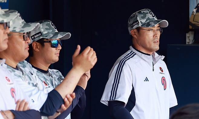 | 무거운 어깨 프로야구 두산 조성환 감독대행(오른쪽)이 3일 서울 잠실구장에서 열린 2025 KBO리그 KIA전에서 코치진과 함께 경기를 지켜보고 있다. 이승엽 감독이 전날 자진 사퇴하면서 조 대행은 이날부터 두산을 이끌게 됐다. 뉴스1 |