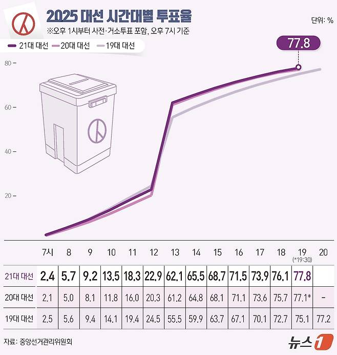 (서울=뉴스1) 윤주희 디자이너 = 제21대 대통령 선거 본투표 날인 3일 오후 7시 기준 전국 투표율이 77.8%로 집계됐다. 중앙선거관리위원회에 따르면 이날 오전 6시부터 현재까지 전국 유권자 4439만1871명 중 3455만2379명이 투표를 마쳤다.