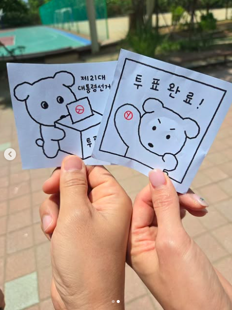 3일 김정화는 개인 계정에 “투표완료. 날씨가 너~~무 좋아요. 저는 즐거운 마음으로 투표하고 출근합니다. 커피드시러 오세요”라며 남편 유은성과 찍은 투표 인증샷을 공개했다.