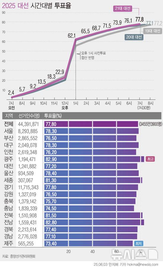 [서울=뉴시스] 제21대 대통령선거 투표가 종료까지 1시간 남은 가운데, 전국 투표율은 오후 7시 기준 77.8%로 잠정 집계됐다. 이는 지난 2022년 20대 대선 최종 투표율인 77.1%보다 0.7%포인트(p) 높은 수치다. (그래픽=안지혜 기자)