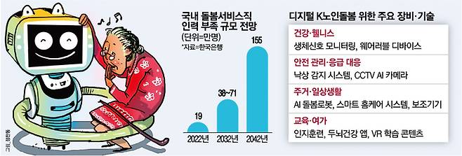 3일 통계청에 따르면 한국의 만 65세 이상 인구 비중은 지난해 19.2%에서 2042년 35.5%까지 급증할 것으로 추정된다. 노인 인구는 지속해서 늘어나는데, 정작 이들을 보살필 돌봄 인력은 태부족이다. 한국은행에 따르면 간병인으로 대표되는 국내 돌봄서비스직 공급 부족 규모는 2022년 19만명에서 2042년엔 최대 155만명 수준까지 늘어날 것으로 전망된다.