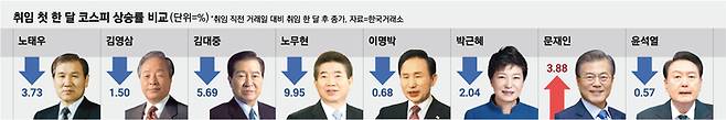 1988년 노태우 전 대통령과 1993년 김영삼 전 대통령 취임 한 달 후 코스피는 각각 3.73%, 1.5% 하락했다.
