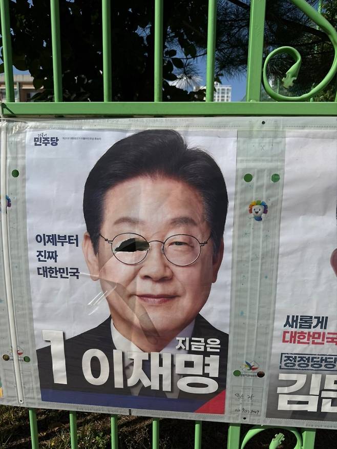 진천경찰서는 오늘(3) 오후 4시 20분쯤, 진천군 덕산읍의 한 중학교 앞에 붙어있던 더불어민주당 이재명 후보 벽보의 얼굴 부분이 찢어진 것을 확인해 주변 CCTV를 통해 용의자를 추적하고 있습니다.