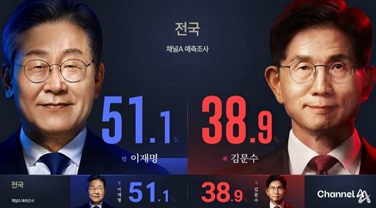 채널A가 진행한 제 21대 대선 예측조사 결과, 더불어민주당 이재명 후보가 51.1%, 국민의힘 김문수 후보가 38.9%를 개혁신당 이준석 후보는 8.7%를 득표할 것으로 예측됐습니다.