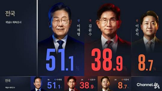 채널A 예측조사…이재명 51.1%, 김문수 38.9%, 이준석 8.7%