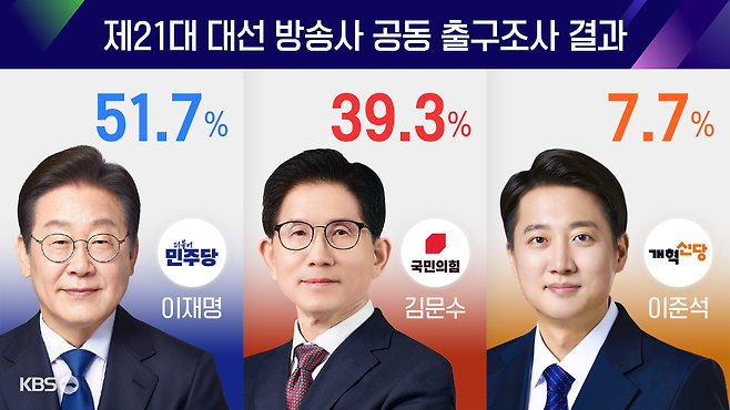 KBS·MBC·SBS가 오늘(3일) 실시한 출구조사 결과 민주당 이재명 후보는 51.7.%, 국민의힘 김문수 후보는 39.3%를 얻어, 이 후보가 12.4%p 앞서는 것으로 나타났습니다.