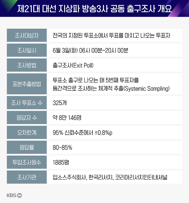 이번 조사는 KBS, MBC, SBS 등 방송 3사가 입소스주식회사, 한국리서치, 코리아리서치인터내셔널 등 3개 조사기관에 의뢰해 선거 당일인 오늘 오전 6시부터 오후 8시까지 전국 325개 투표소에서 매번 5번째 나오는 투표자 8만 146명을 상대로 실시됐으며, 예상 응답률은 80~85%, 오차범위는 95% 신뢰수준에서 ±0.8%p입니다.