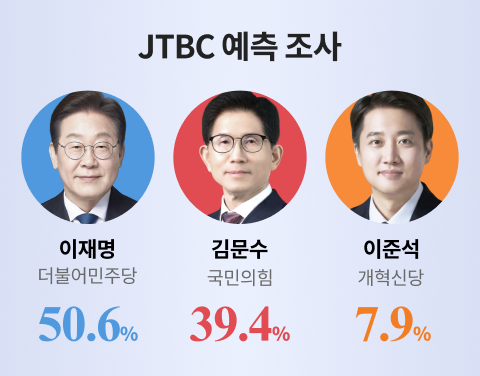 JTBC 예측조사에서는 이재명 후보 50.6%, 김문수 후보 39.4%, 이준석 후보가 7.9%를 각각 기록했다.
