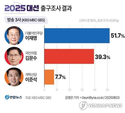 KBS, MBC, SBS 등 지상파 방송 3사는 3일 오후 8시 출구조사에서 이재명 후보가 51.7%, 김문수 후보가 39.3%를 기록했다고 일제히 보도했다.