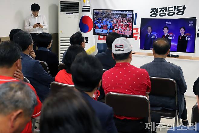 출구조사 발표 전까지 국민의힘 제주도당에 모인 선대위 관계자 및 지지자들은 급하게 치러진 조기 대선 선거운동 대장정을 마친 서로를 격려하며 방송3사 출구조사 결과를 지켜봤다.