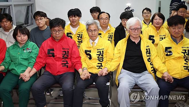 (서울=연합뉴스) 김인철 기자 = 민주노동당 권영국 대선 후보가 3일 서울 구로구 선거캠프에서 제21대 대통령선거 출구조사 결과를 지켜보고 있다. 2025.6.3