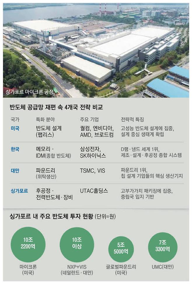 현재 세계 반도체 산업은 미국·대만·한국·중국·일본이 주도한다. 미국은 칩 설계(팹리스), 대만은 위탁생산(파운드리), 한국은 메모리 중심의 종합 반도체 체계를 구축해왔다. 중국은 내수 시장과 정부 주도 전략을, 일본은 소재·부품 중심의 공급망을 강화하는 방식이다. 여기에 싱가포르가 후공정과 전력반도체를 앞세워 차세대 생산 거점으로 급부상하고 있다.