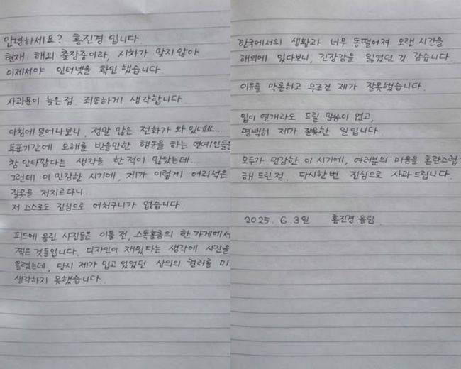 홍진경은 3일 오후 개인 SNS에 자필 사과문을 게재했다. 하루 전 SNS에 '빨간 옷'을 입고 찍은 사진을 올렸다가 21대 대선에 관한 정치색 논란에 휩싸이자 이를 사과한 것이다.