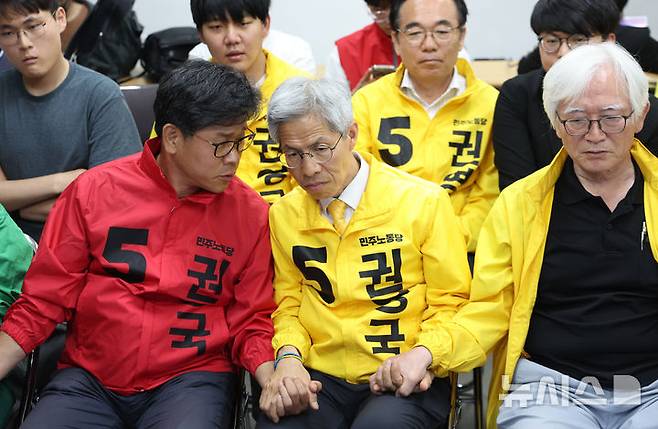 [서울=뉴시스] 김진아 기자 = 권영국 민주노동당 대선 후보가 3일 서울 구로구 민주노동당사에 마련된 선거캠프에서 제21대 대통령 선거 출구조사 결과를 지켜보고 있다. 2025.06.03. bluesoda@newsis.com