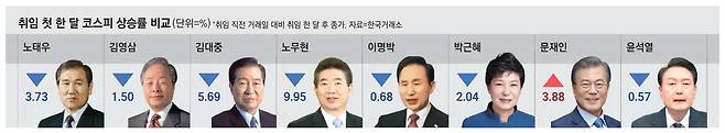 취임 1년 뒤 코스피가 오른 정권이 4개, 떨어진 정권이 4개로 팽팽히 맞섰다. 노태우(39.86%), 김영삼(36.7%), 노무현(40.66%), 문재인(7.48%) 정권에서는 취임 1년 뒤 코스피가 상승했다. 김대중(-7.72%), 이명박(-36.73%), 박근혜(-2.68%), 윤석열(-4.38%) 정권에서는 취임 1년 뒤 코스피가 하락했다.