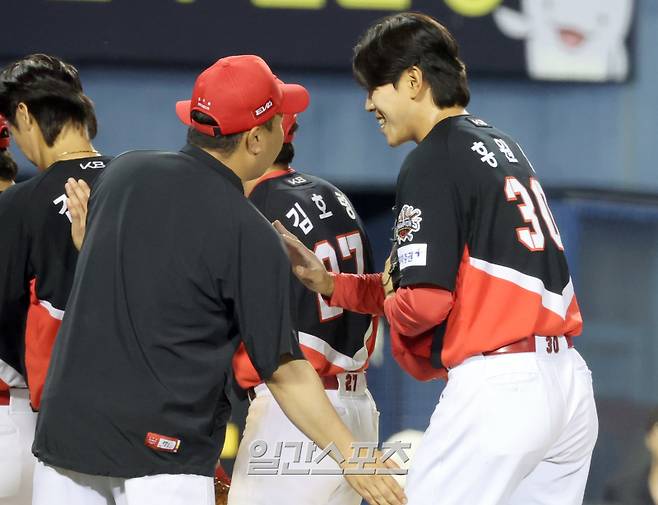 KIA가 11-3 승리했다. 경기종료후 이범호 감독이 투수 홍원빈과 승리 세리머니 하고 있다.