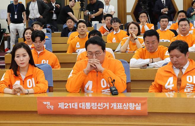 반면 국회도서관에 마련된 개표상황실에 자리한 국민의힘 선대위 관계자들은 굳은 표정으로 방송사 출구조사 결과를 지켜봤다. 10% 득표율을 목표로 했던 개혁신당 관계자들도 아쉬운 표정을 감추지 못했다.