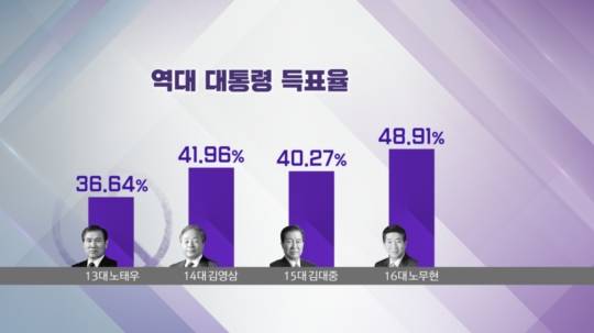 13대 대선에서 노태우 대통령이 36.64%, 김영삼 대통령이 41.96%, 김대중 대통령이 40.27%를 기록했고요.