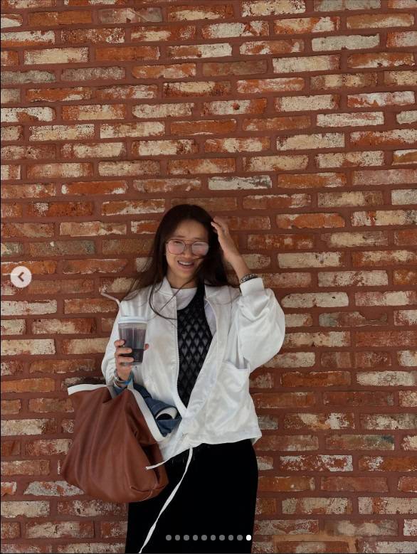 특히 캐주얼한 스타일과 함께 넉넉한 브라운 백, 자연스러운 포즈, 여유로운 표정이 어우러져 평온한 일상 속 행복을 전하고 있다.