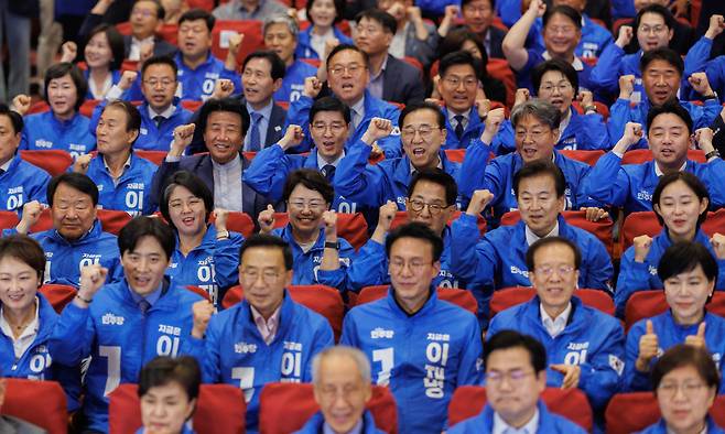 이재명 민주당 후보가 김문수 국민의힘 후보를 12.4%p 큰 격차로 앞서는 결과가 발표된 직후, 민주당 상황실에 앉아 있던 현역 의원들은 기쁨을 감출 새 없이 비명을 지르며 일제히 기립 박수를 쳤다.
