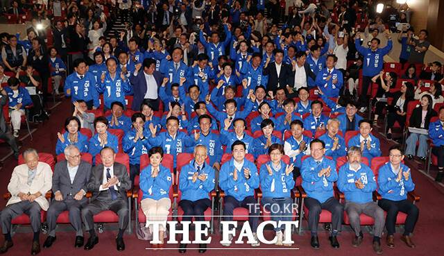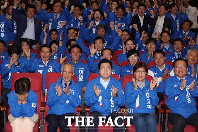[더팩트ㅣ국회=배정한 기자] 더불어민주당 윤여준·박찬대 상임 총괄선대위원장을 비롯한 공동선대위원장들이 3일 서울 여의도 국회 의원회관에 마련된 제21대 대통령선거 개표 상황실에서 출구조사 결과 발표가 나오자 기뻐하고 있다.