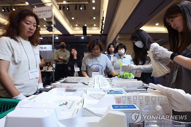 (서울=연합뉴스) 김도훈 기자 = 제21대 대통령 선거일인 3일 서울 광진구 세종대학교 컨벤션센터에 설치된 개표소에서 개표사무원들이 표를 분류하고 있다. 2025.6.3