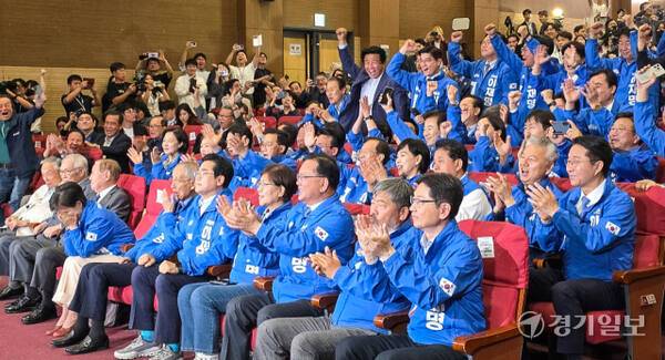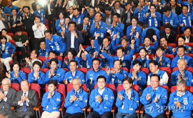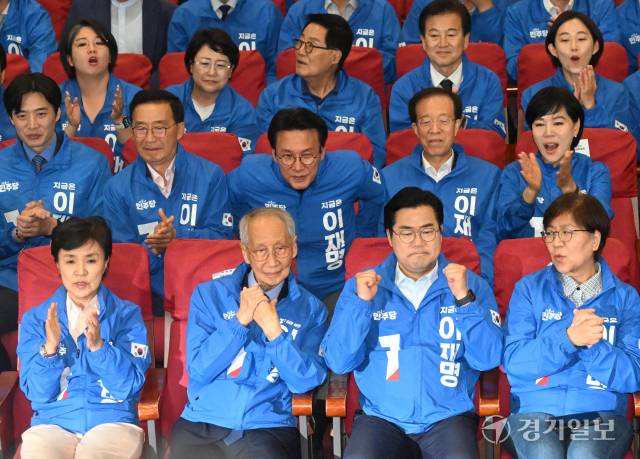 더불어민주당 윤여준, 박찬대 상임총괄선대위원장 등이 3일 오후 국회의원회관 개표상황실에서 제21대 대통령선거 지상파 출구조사 결과에서 이재명 후보가 51.7%로 앞서는 것으로 발표되자 환호하고 있다. 조주현기자