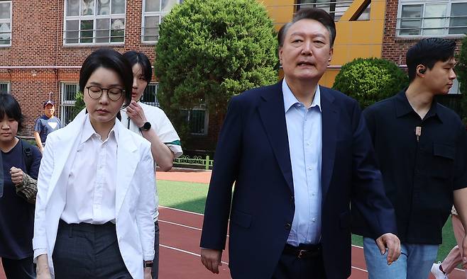 | 윤석열 전 대통령과 부인 김건희씨(왼쪽)가 3일 서울 서초구 자택 인근 원명초등학교 투표소에서 6·3 대선 투표를 마치고 걸어가고 있다. 이제원 선임기자 |