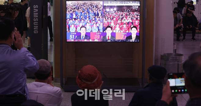 이 같은 출구조사 결과가 발표되자 150여명이 모인 서울역 대합실은 순식간에 조용해졌다. 이어 이재명 후보 지지자로 추정되는 시민들의 환호성과 박수 소리가 뒤를 이었다.