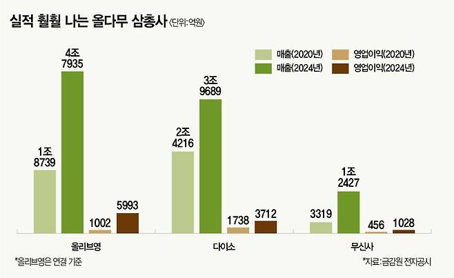 숫자부터 남다르다. 올다무 모두 실적이 가파른 상승 곡선을 그린다. 팬데믹이 시작한 2020년부터 지난 2024년까지, 세 곳 모두 영업이익 증가율이 100%가 넘는다. 같은 기간 매출도 조 단위 성장을 이뤄냈다.
